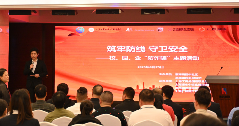4月25日下午1点,我校艺术设计与传媒学院法律专业师生和法研社联动惠南镇园区服务站、惠园派出所、上海浦东中银富登村镇银行、上海汇展资产管理有限公司等20多家企业代表,开展了一场别开生面的校、园、企“防诈骗”主题活动。与会嘉宾有惠南镇园中社区副书记许家玮,惠南镇园区服务站站长唐勇,副书记徐洪斌,上海工商外国语职业学院艺术设计与传媒学院法律教研室教师马文婷、曲岩、张诚,惠园派出所警长盛黄欢,上海浦东中银富登村镇银行行长丁卯等。