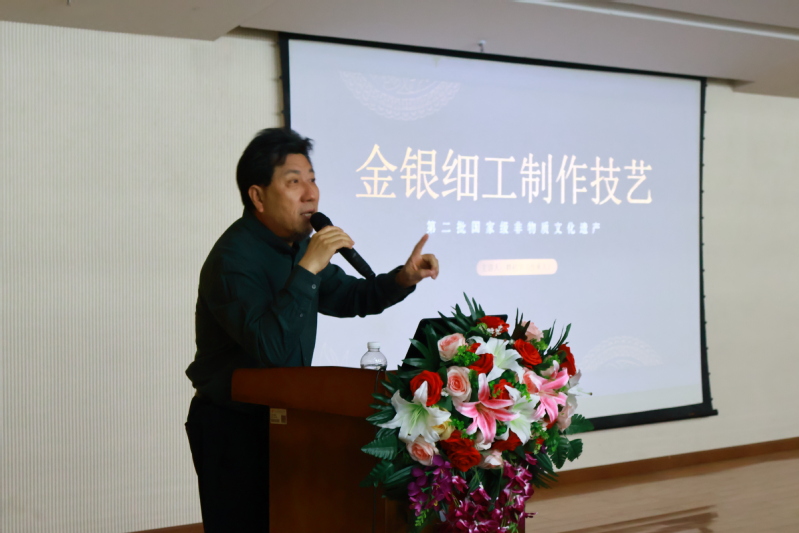 4月23日,由艺术设计与传媒学院承办的“恒孚银楼金银细工非遗艺术专题讲座暨精品展”在学院图书馆隆重启幕。活动特邀苏州市姑苏区非物质文化遗产金银细工技艺代表性传承人赖杭宇担任主讲嘉宾,艺术设计与传媒学院院长李宪锋主持活动。来自本校及上海思博职业技术学院的师生代表共聚一堂,沉浸式感受传统工艺与现代美学的交融碰撞。