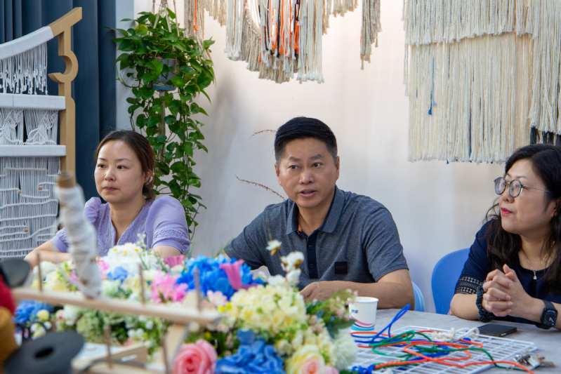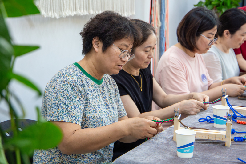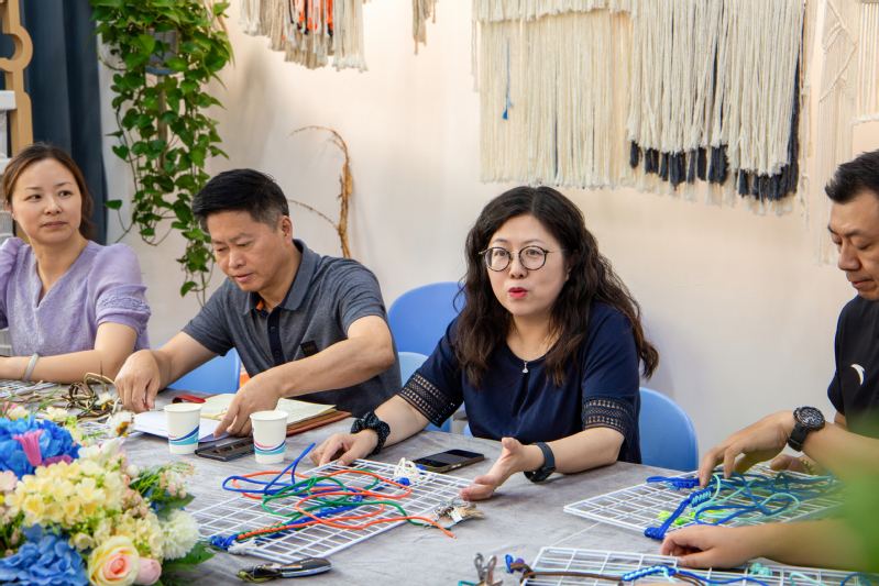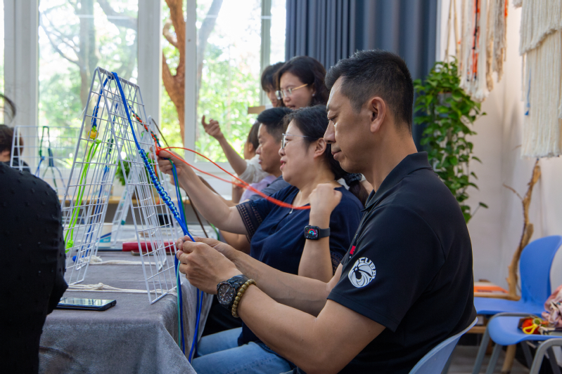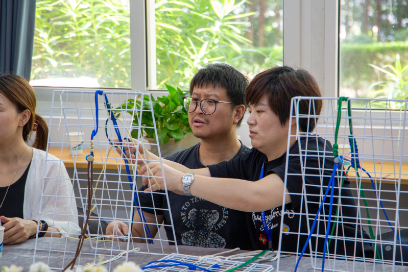 在学习过程中,参与教师们两两结伴,互帮互助。在名师团队耐心细致的指导下,一根根色彩斑斓的彩带在教职工们的手中逐渐变幻成一件件寓意吉祥的精美编织作品。现场氛围温馨融洽,欢声笑语不断,大家在动手实践中感受着非遗技艺的独特魅力。