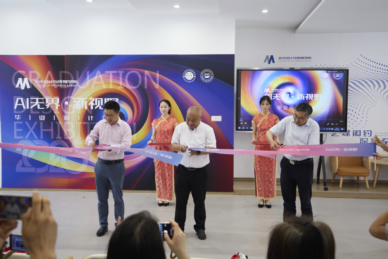 5月22日中午,艺术设计与传媒学院2025届毕业作品展“AI无界·新视界”在学院隆重启幕。校党委书记万峰、校长黄正、副校长冯渊,各学院院长、职能部门负责人及师生代表齐聚一堂,共同见证这场科技与艺术深度碰撞的创意盛宴。开幕式由艺术设计与传媒学院院长李宪锋主持。