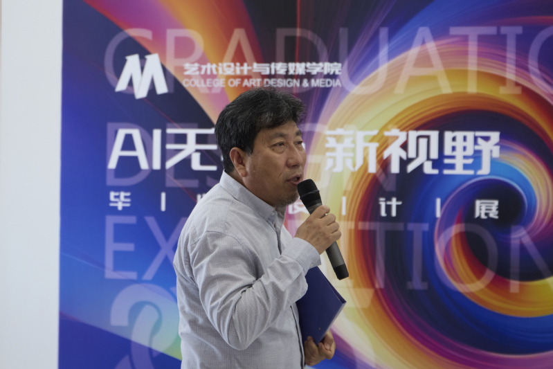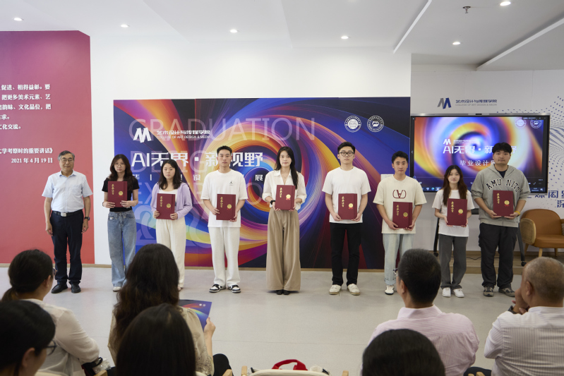 随后,冯渊副校长为优秀指导教师及毕业生颁发荣誉证书。优秀指导教师代表王李哲在发言中坦言:“AI并非创作的对手,而是激发灵感的伙伴。本届作品充分证明,当技术理性与艺术感性共振时,边界将被无限打破。”优秀毕业生代表李臻蕾则以个人作品为例,分享了如何完成设计,并深情致谢学院“以美育浸润创新思维”的培养模式。