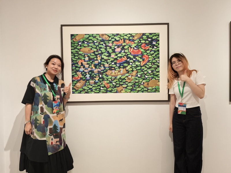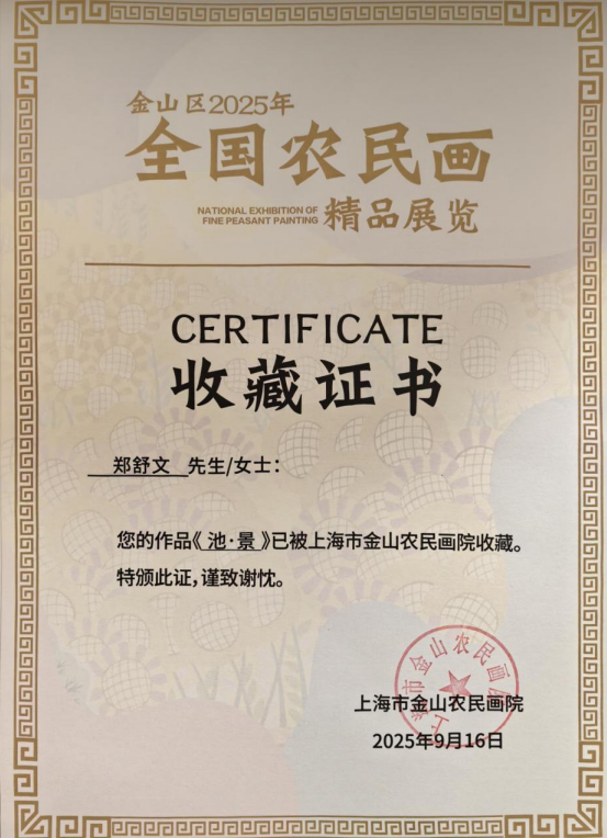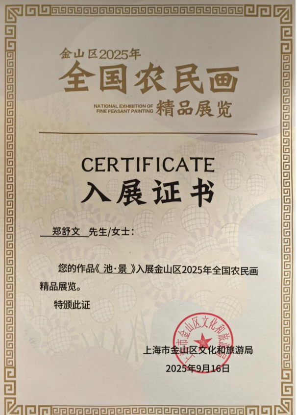 郑舒文老师与邬笑悦同学共创的《池.景》,以乡土池塘为创作原型,通过水粉与民间绘画技法的融合,营造出宁静悠远的田园意境,该作品早在今年6月便已入选“首届中国乡土绘画作品展”,并凭借鲜明的地域特色与艺术感染力,成功入围今年9月的“全国农民画精品展”,目前作品被中国金山农民画院收藏,成为学院教学成果与艺术创作实力的重要见证。