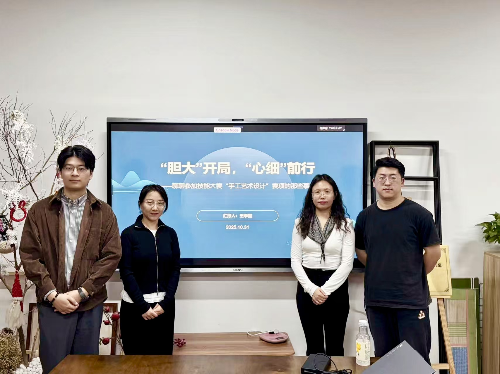 025年10月30日中午,环境艺术设计名师工作室第三期公开课在艺术设计与传媒学院李宪锋院长指导、名师工作室负责人和水英教授主持下举行。游戏艺术设计教研室主任、泥声心语陶艺工坊主理人王李喆老师以“‘胆大’开局,‘心细’前行——手工艺术设计赛项备赛心得”为题作专题分享。