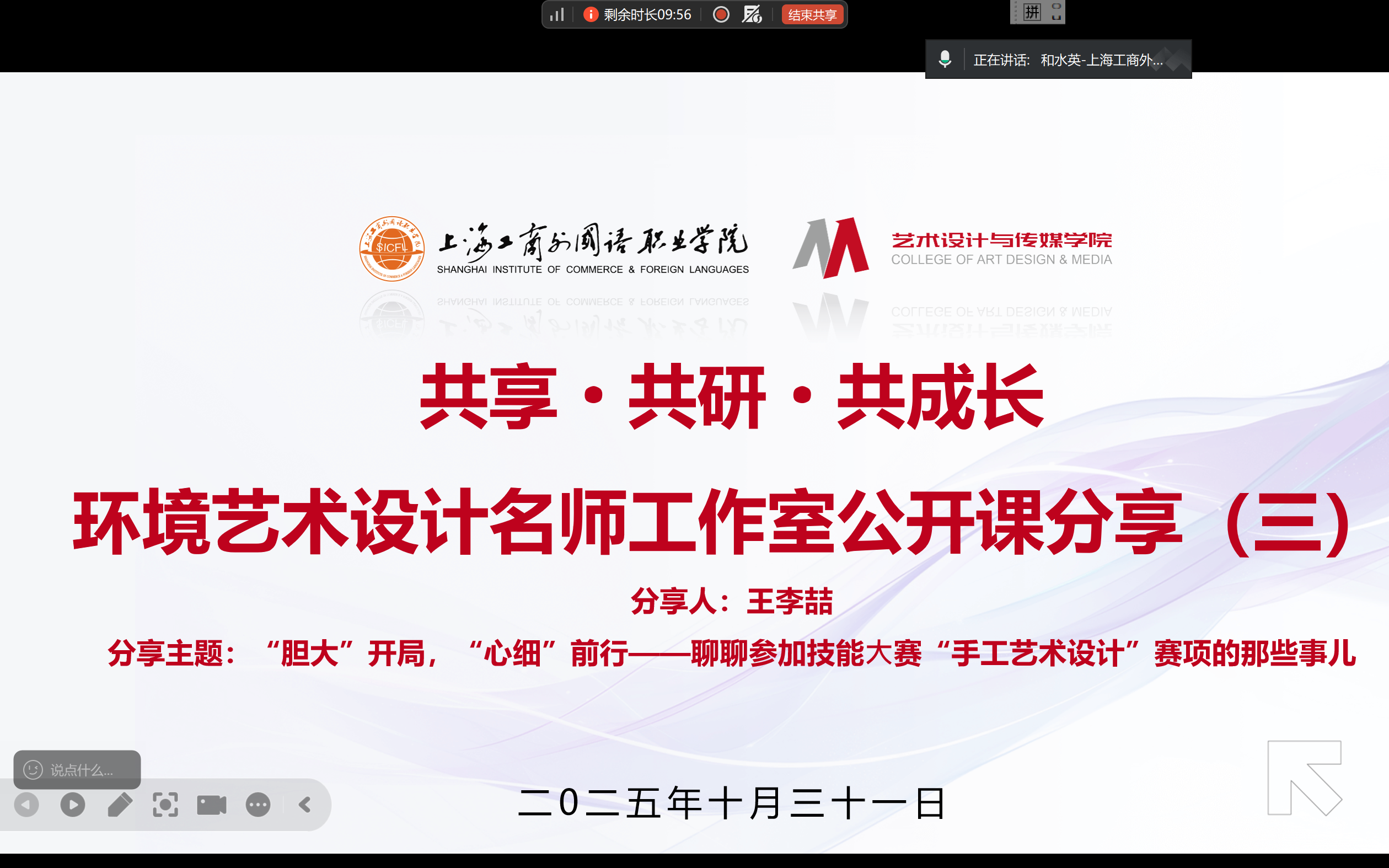 025年10月30日中午,环境艺术设计名师工作室第三期公开课在艺术设计与传媒学院李宪锋院长指导、名师工作室负责人和水英教授主持下举行。游戏艺术设计教研室主任、泥声心语陶艺工坊主理人王李喆老师以“‘胆大’开局,‘心细’前行——手工艺术设计赛项备赛心得”为题作专题分享。
