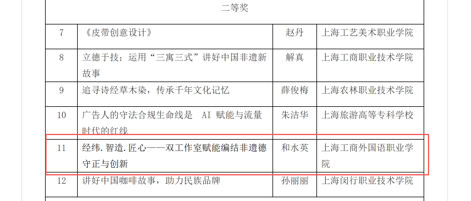 环境艺术设计专业和水英教授主持的《经纬・智造・匠心——双工作室赋能编结非遗的守正与创新》案例,凭借鲜明特色与突出成效,在上海高职高专首届课程思政优秀(经典)案例遴选结果公示中荣获上海高职高专首届优秀案例二等奖。本次评选由上海高职高专思想政治理论课建设联盟等三大单位联合主办,旨在推进职业教育课程思政内涵式发展。和水英教授的案例聚焦传统编结非遗传承危机,响应国家非遗活态传承与产教融合政策,首创“禾风织造+营匠数字建模”双工作室模式,构建“双轨贯通、五域联动、分层进阶”教学体系。案例以 “经纬・智造・匠心”为思政主线,将二十四节气文化融入教学,通过数字建模与手工实践的闭环训练,破解非遗与教育脱节、思政融入生硬等行业痛点。此次获奖是我校课程思政建设的重要突破,彰显了学校在非遗传承与专业教育融合领域的探索成效。