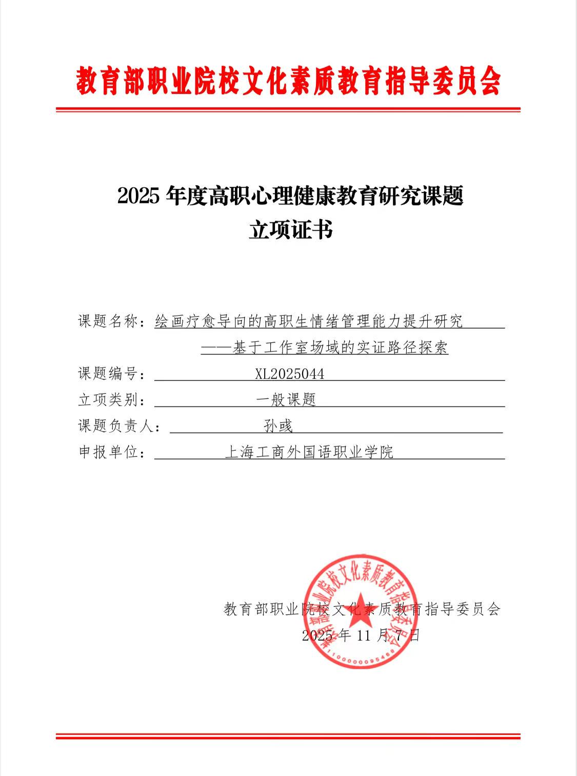 艺术设计(少儿美术)专业教师孙彧博士主持的“2025年度高职心理健康教育研究课题”在教育部职业院校文化素质教育指导委员会公布立项名单中成功获批。该课题聚焦高职学生心理健康教育重点难点,贴合职业教育文化育人导向,兼具理论价值与实践意义。此次立项是学院科研实力与育人理念的双重体现,将为高职院校心理健康教育改革提供有益参考。此次科研立项的突破,标志着学院在特色学科方向上的研究实力得到权威认可,也为后续科研成果转化、服务区域文化产业发展奠定了坚实基础。