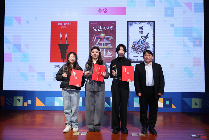 本次大赛由上海视觉艺术学院、上海市松江区司法局主办,旨在以公益广告为载体,推动法治素养培育。赛事共吸引长三角地区16所民办高校参与,征集作品近800件,涵盖法治宣传、社会关怀、网络文明、交通安全等多个主题,经多轮评审,最终评选出金奖3名、银奖6名、铜奖20名、优秀奖50名,及若干优秀组织奖与指导教师奖。学校历来坚持“以赛促学、以赛促教”,对此次赛事给予全方位支持,积极组织学生备赛参赛。各学院指导老师结合丰富的教学经验与过硬的专业能力,为参赛学子提供细致指导;参赛学子立足青春视角,将宪法精神、法治理念与公益话题融入海报设计,以多元艺术形式诠释对法治的理解,在激烈竞争中交出亮眼答卷。本次赛事全场仅设3枚金奖,其中,我校吴涵同学在王玉老师指导下,凭借作品《新生·冬眠》的深刻立意与出色表现力成功摘金,充分展现我校学子在法治与艺术融合领域的扎实功底与创新能力。