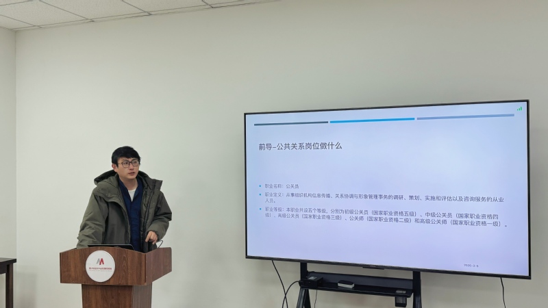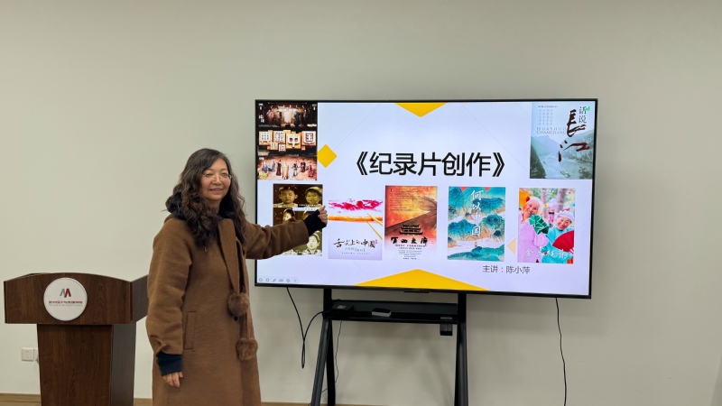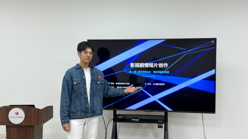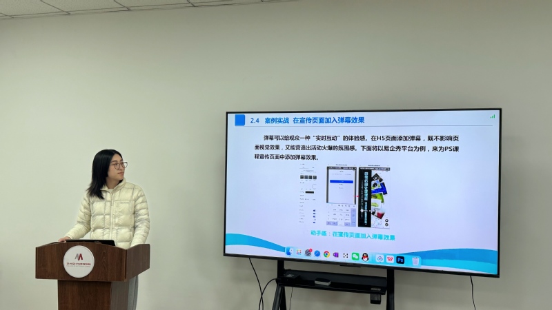 陈小萍老师主讲《纪录片创作》课程,该课程从纪录片的基础理论入手,逐步深入到文案创作、声音采集、选题策划、拍摄剪辑等实践环节,最后以作品创作与讲评收尾,形成完整的教学闭环,进一步培养学生的纪录片创作能力。张皓然老师主讲《影视剧情短片创作》课程,该课程紧跟人工智能赋能内容创作的时代趋势,将AIGC技术深度融入课程教学,进一步培养熟练运用AI工具的复合型影视人才。冯振飞老师主讲《公共关系实务》课程,该课程从“公关员”的职业定位切入教学,并结合国家职业资格标准,将课程内容与行业认证体系对接,帮助学生建立清晰的职业发展路径。韩润萌老师主讲《新媒体界面设计》课程,该课程采用“讲解、演示、实操”相结合的教学方式,通过现场演示利用易企秀平台为宣传页面添加弹幕等功能,让学生在动手练习中掌握界面设计技巧,培养实际应用能力。