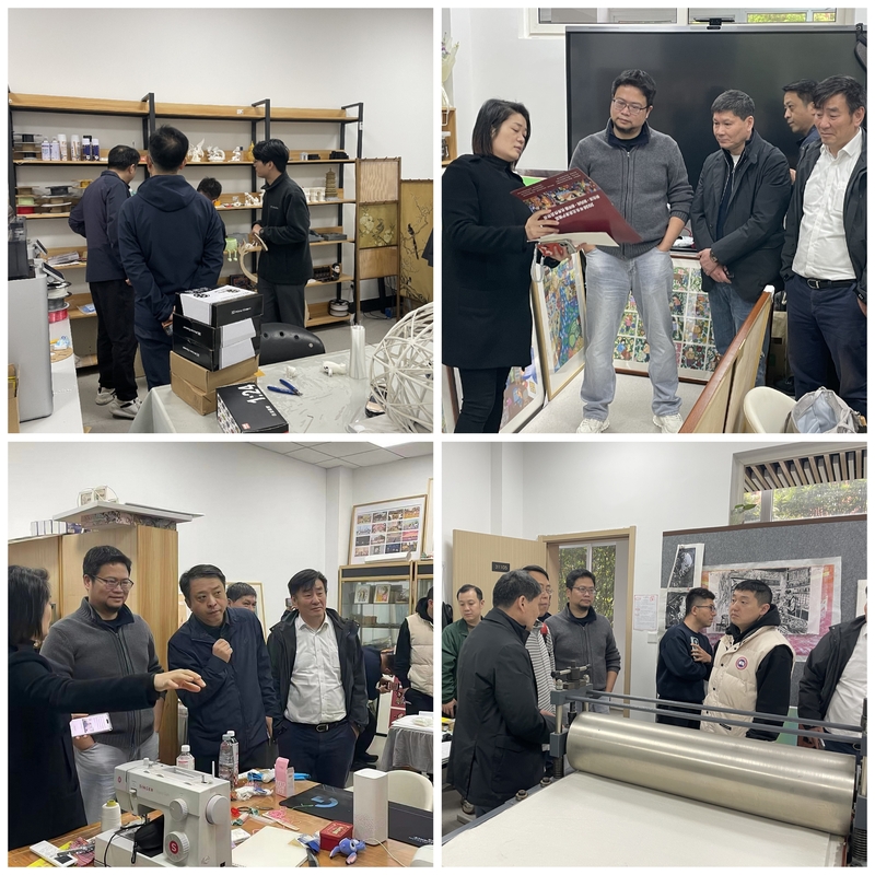在郁院长的陪同下,专家教授一行首先参观了我院8个特色工作室,包括和水英环境艺术设计名师工作室、营匠数字建模工作室、版画工作室、传艺生辉工作室、伴舒艺绘农民画工作室、方絮纸艺工作室、泥声心语陶艺工坊、本立道生皮革工作室。参观过程中,专家们认真聆听各工作室的建设情况、教学成果及发展规划,近距离观看学生实践作品,对工作室的特色定位和实践育人成效给予高度评价。同时,各位专家结合自身行业经验,针对每个工作室的发展,对标行业龙头企业提出了具体的展望与规划,为工作室优化升级、对接产业需求、提升人才培养针对性提供了宝贵思路。随后,双方前往会议室开展座谈交流,为学院文创出海、产教融合、工作室建设及人才培养工作进一步把脉定向、传经送宝。